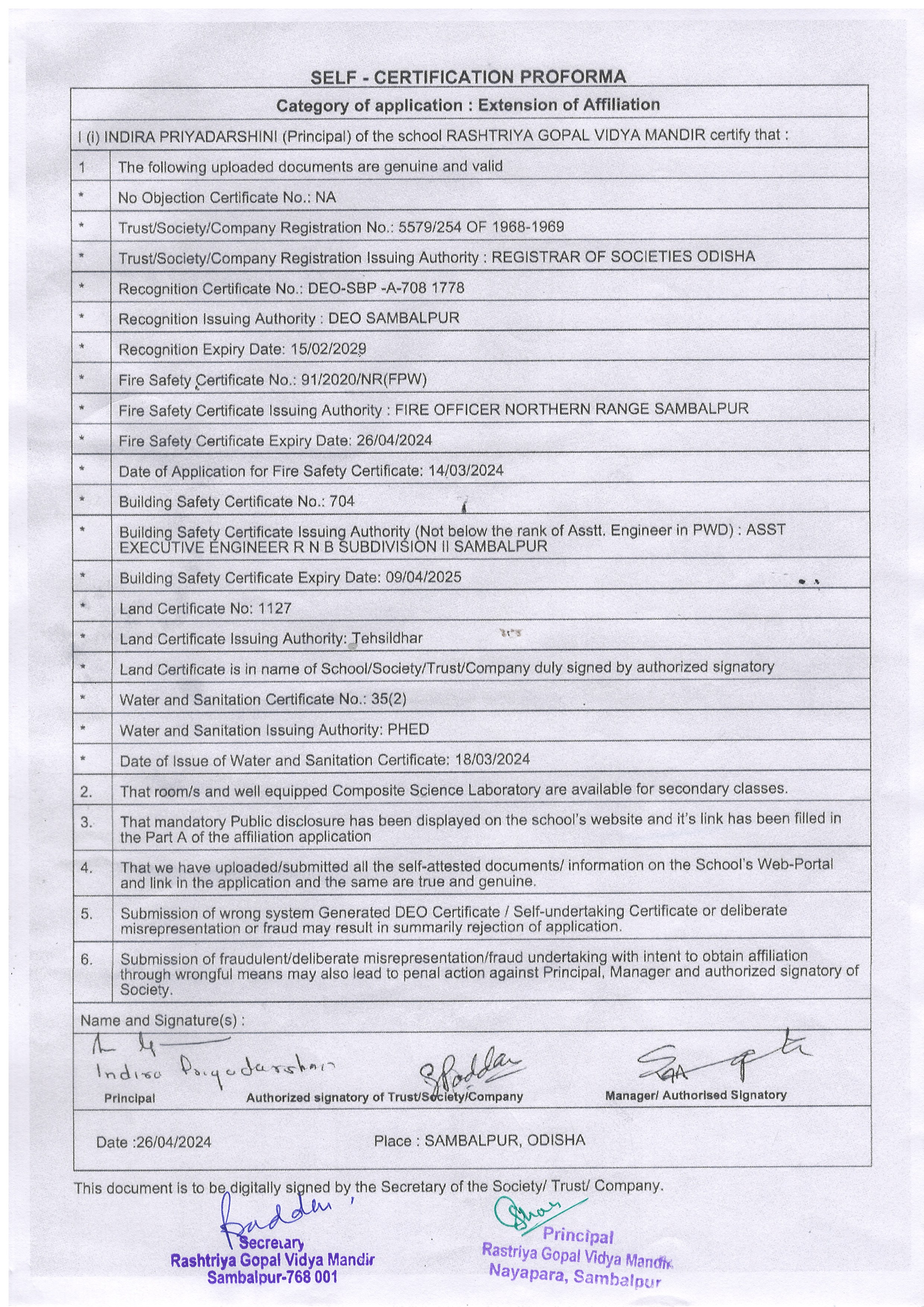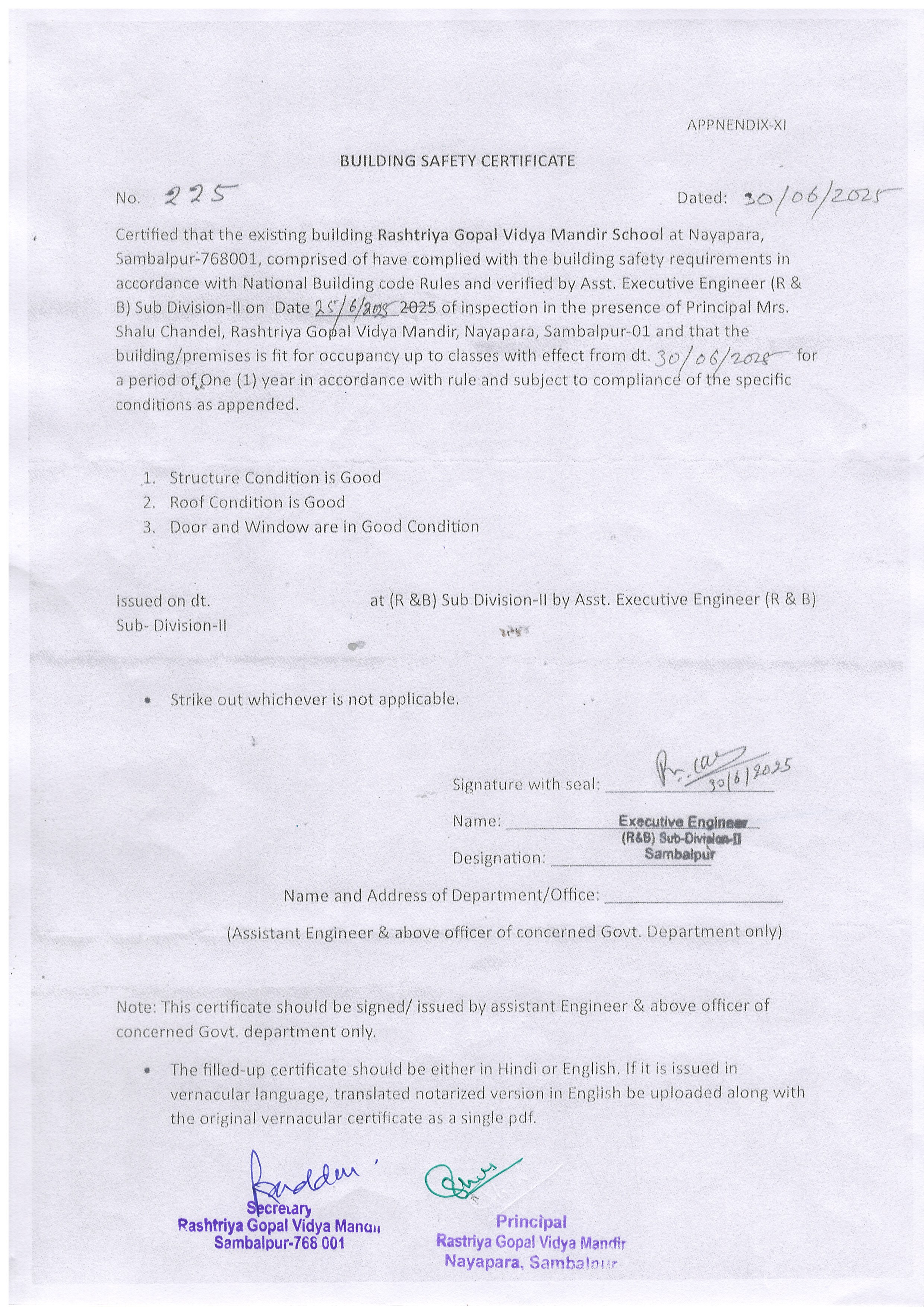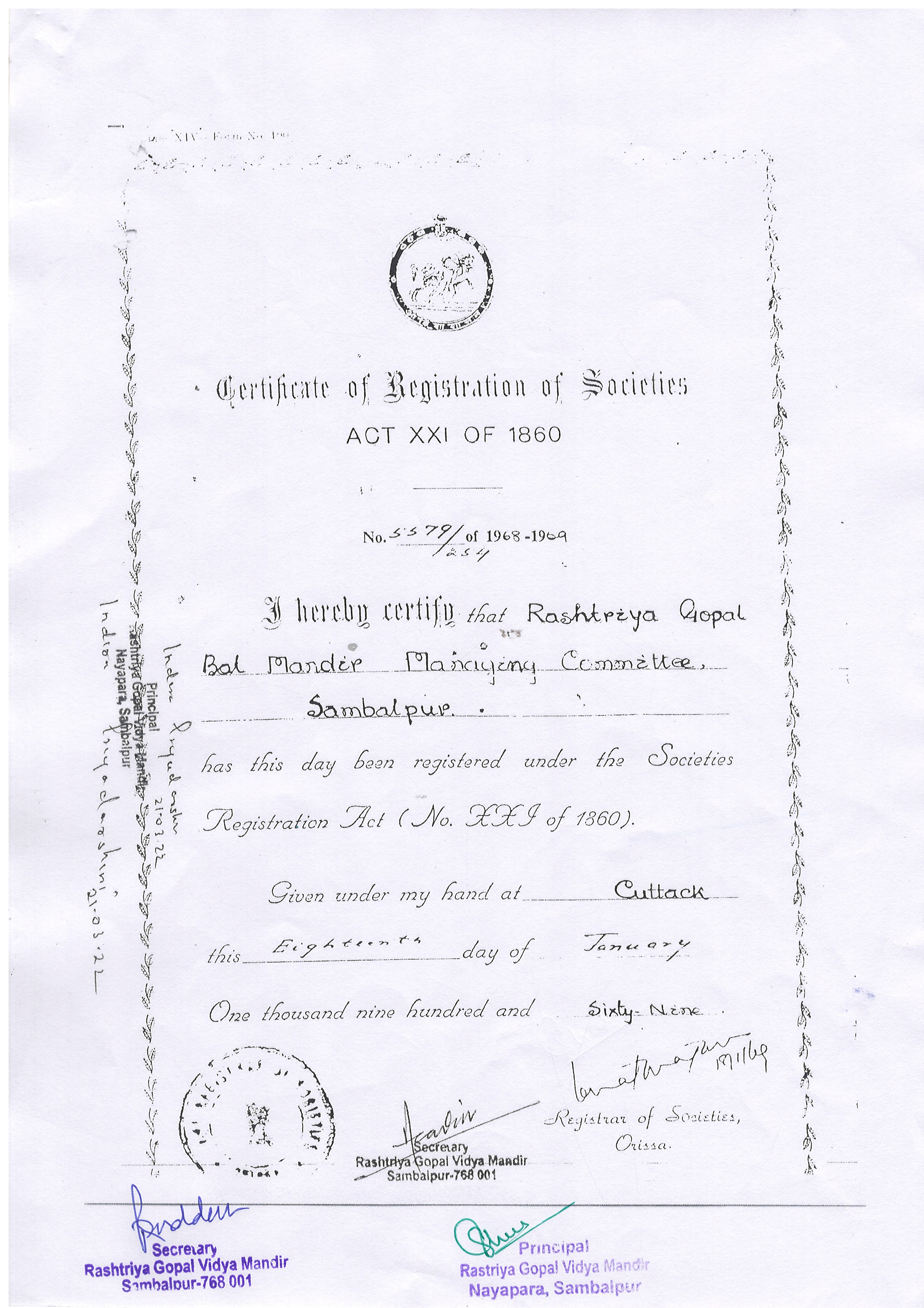 Rahstriya Gopal Vidya Mandir is situated in the heart of Sambalpur between Golebazar and Govt. Bus Stand. It was established on 26th of January 1966 & recognized by C.B.S.E New Delhi. It is the oldest premier educational institution in the city of Sambalpur. The appellant body of this school is its Managing Committee. The School is managed by veteran, learned and highly placed people. Each of the members of the management excels in his/her social position. They are reverend and adored by many. The school is controlled and guided by the Hindi High School Trust. The school is situated amidst lush green surrounding in a serene atmosphere and is going to be equipped with ultra modern infrastructure and a beautiful playground.